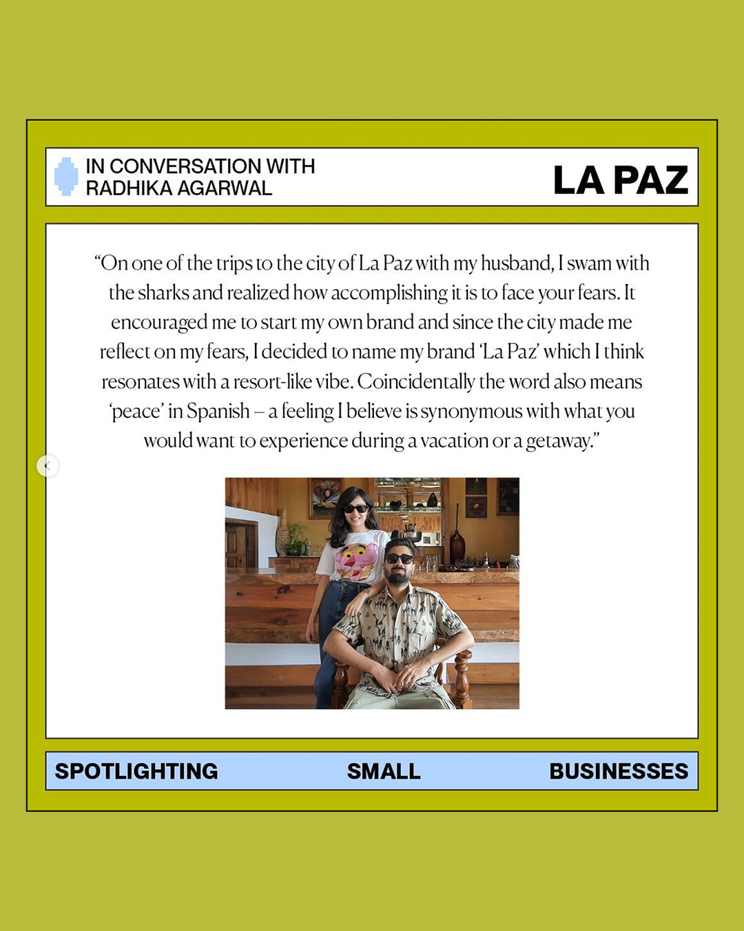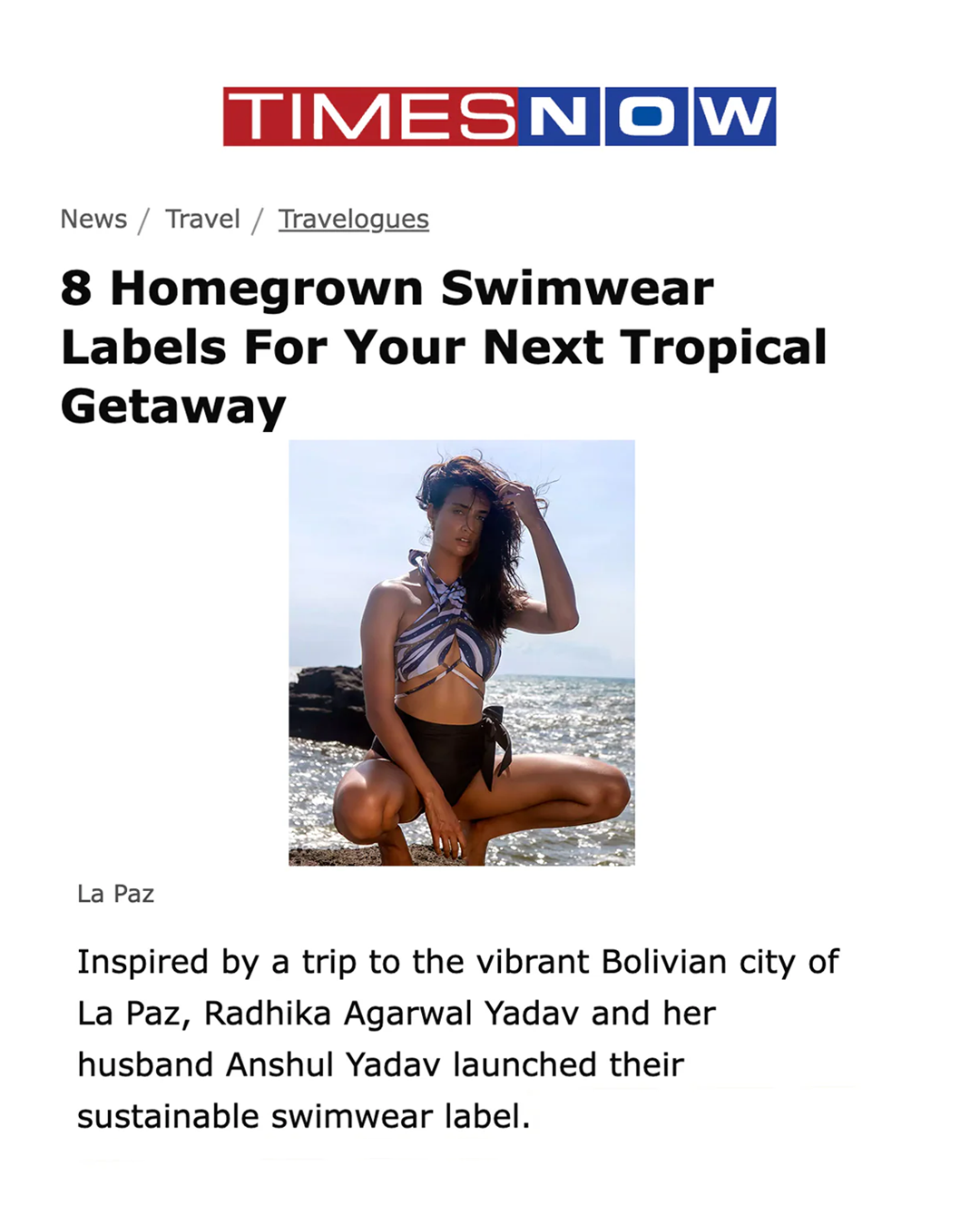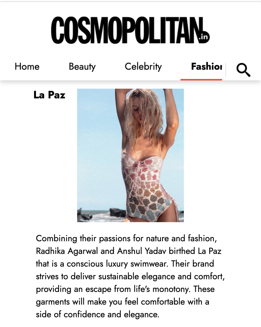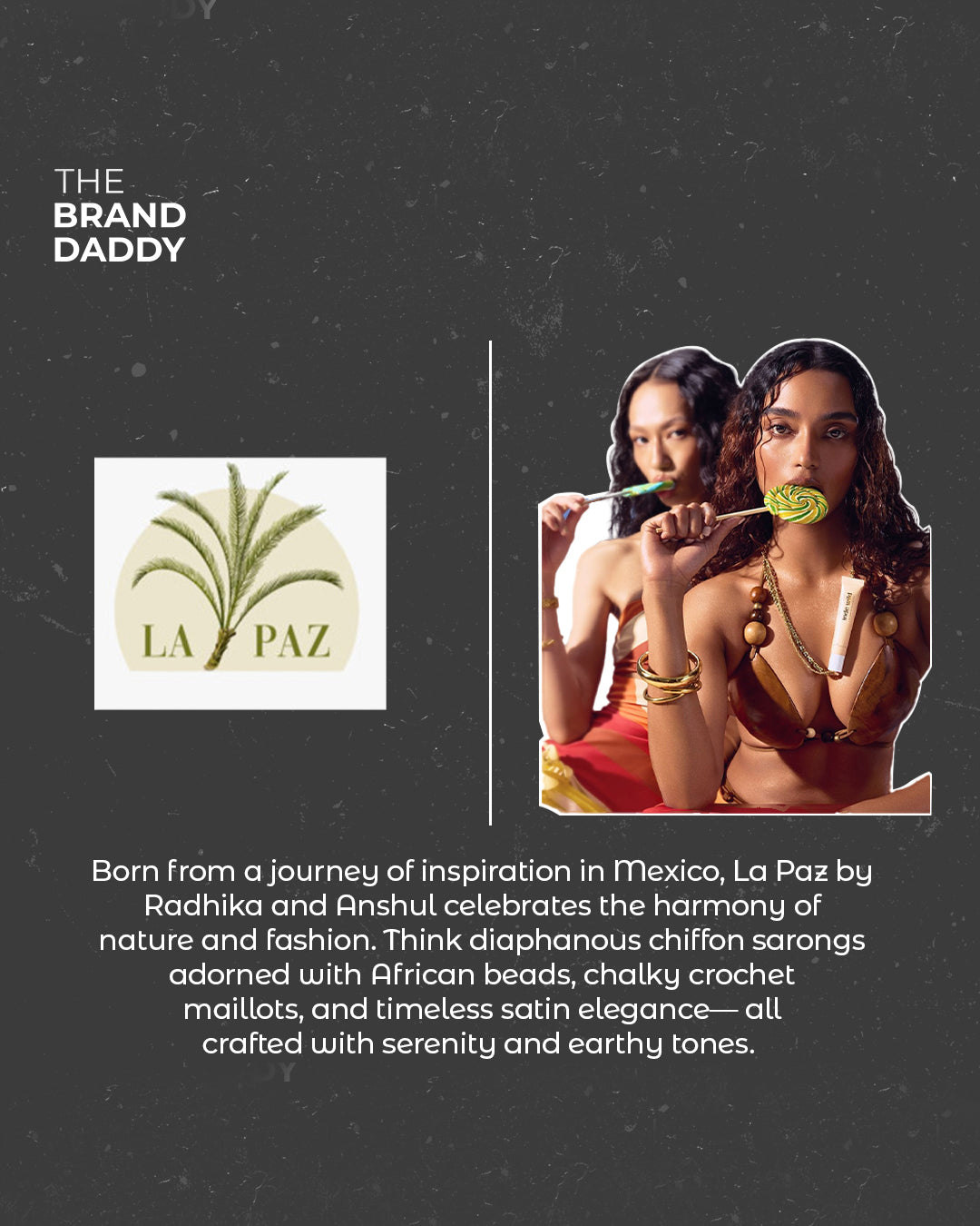 “Combining their passions for nature and fashion, Radhika Agarwal and Anshul Yadav birthed La Paz that is a conscious luxury swimwear.Their brand strives to deliver sustainable elegance and comfort, proving an escape from life’s monotony.
