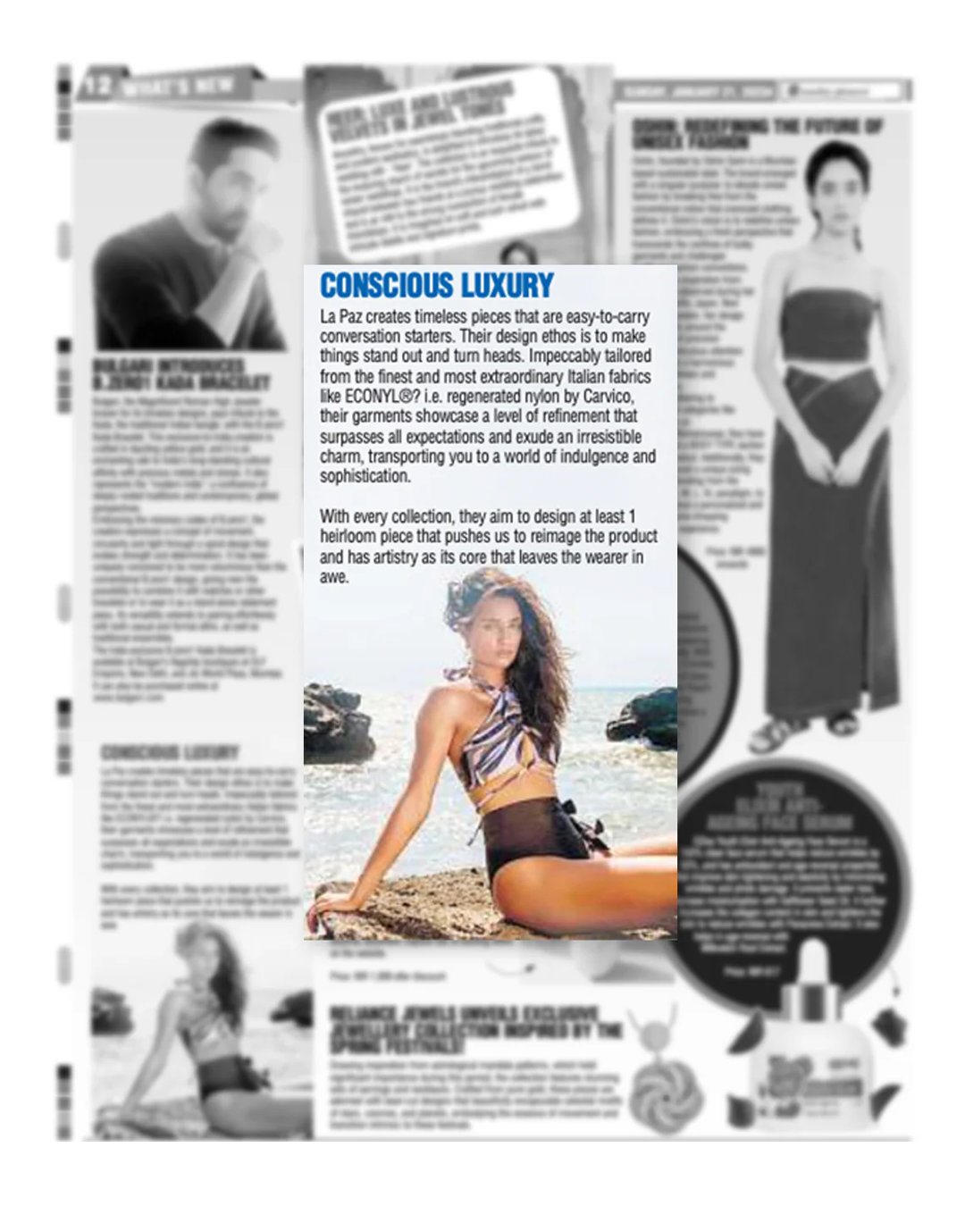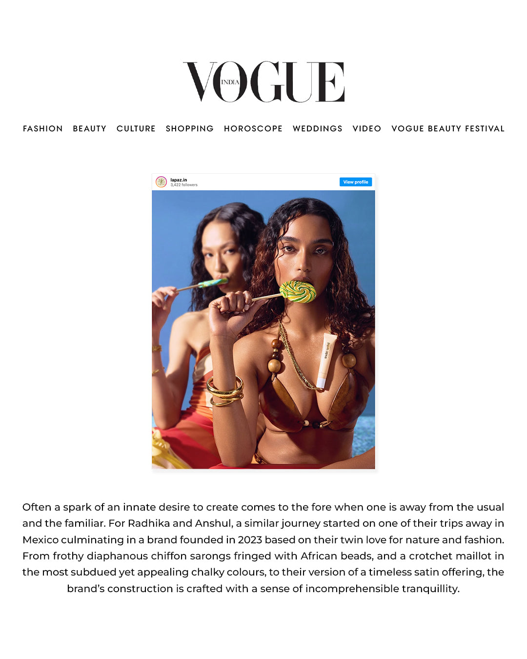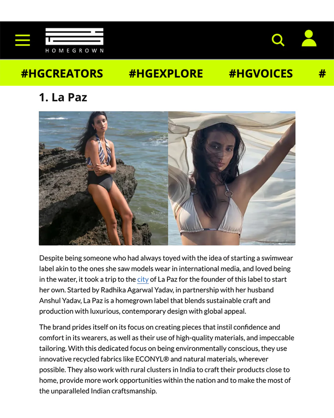 “Combining their passions for nature and fashion, Radhika Agarwal and Anshul Yadav birthed La Paz that is a conscious luxury swimwear.Their brand strives to deliver sustainable elegance and comfort, proving an escape from life’s monotony.