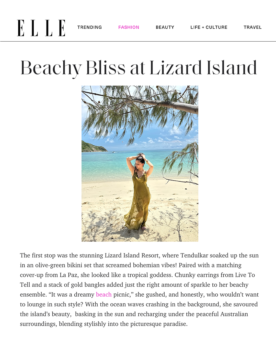 The first stop was the stunning Lizard Island Resort, where Tendulkar soaked up the sun in an olive-green bikini set that screamed bohemian vibes! Paired with a matching cover-up from La Paz, she looked like a tropical goddess.